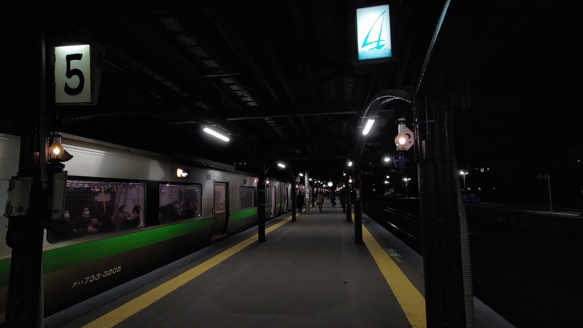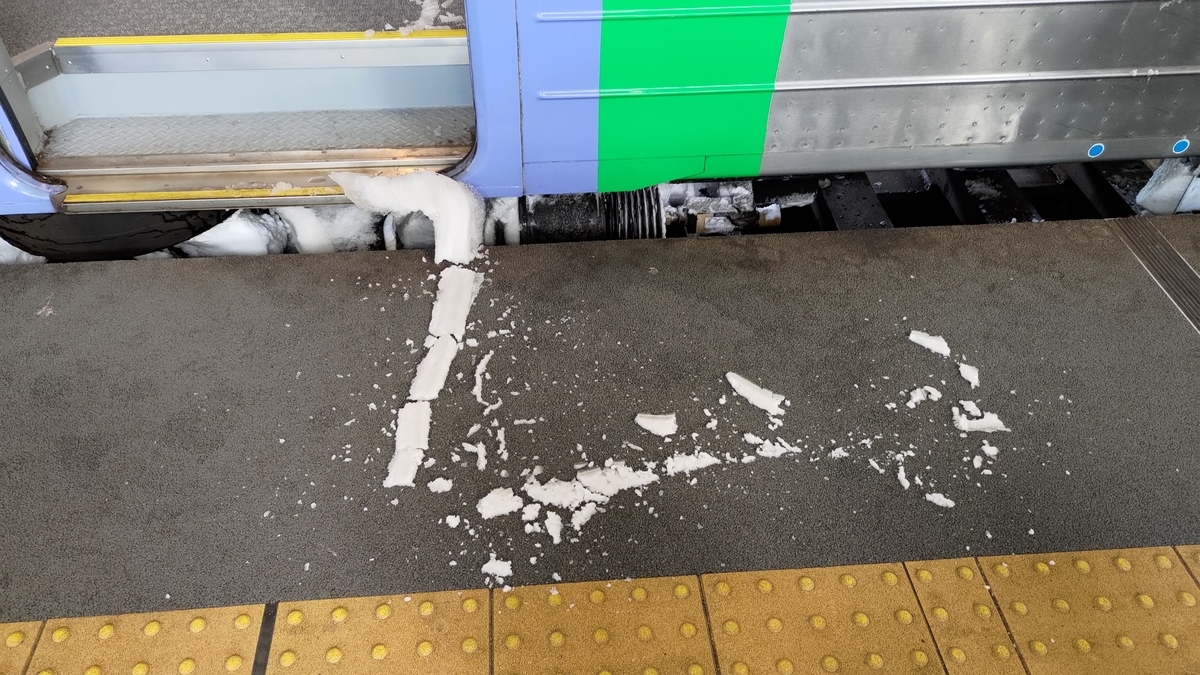 これは下車する時に撮った奴です。北海道の特急車両あるあるで、戸袋手前の場所に凄い量の雪が付加体さながらに積もるんです。その雪の付加体が、ドア開いてもドア枠に付着し直立したままの瞬間が大好きなんですが、いつもこうしてすぐ朽ちてしまうので撮れたためしがありません。