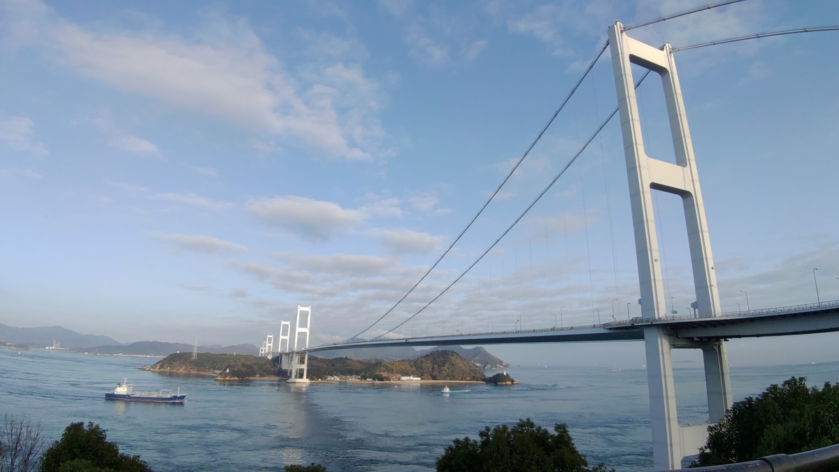 瀬戸内海に浮かぶ島々と結ぶ吊り橋という巨大構造物の共演が美しいです。たぶん景観にも相当配慮されて設計されたのではないでしょうか。